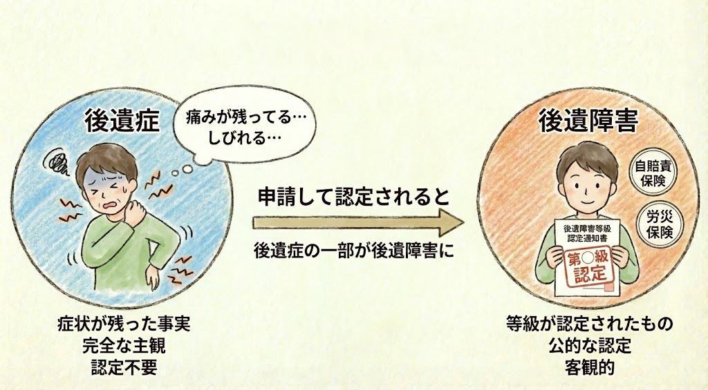 後遺症は単に「症状が残った」という事実を指しています。誰に認定される必要もないうえ完全な主観です。一方、後遺障害は「後遺症の中で、自賠責保険や労災保険によって等級が認定されたもの」を指します。